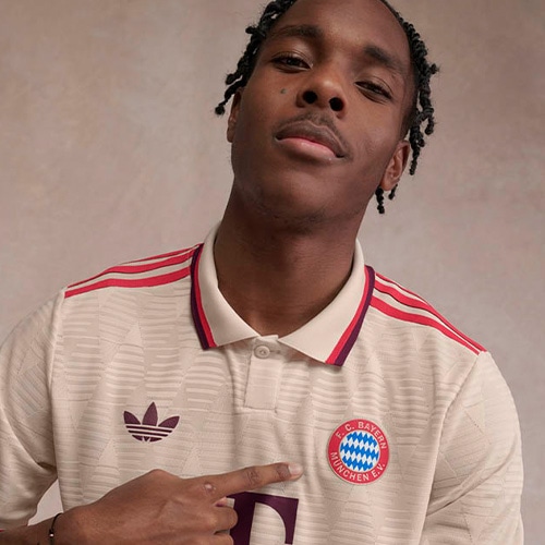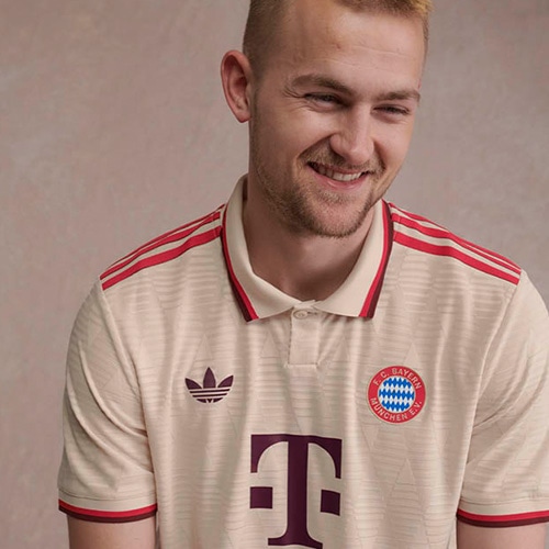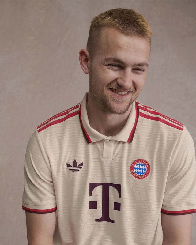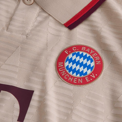 さらにニットのポロ襟やバックネックのFCバイエルンのサインなど、ピッチの外でも映えるデザインに仕上げています。