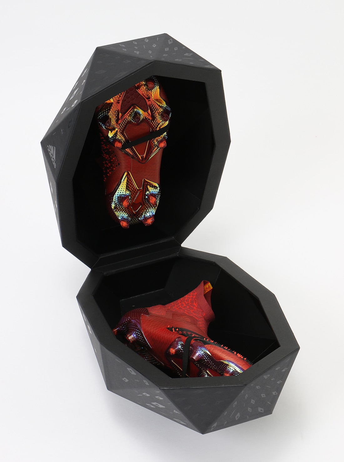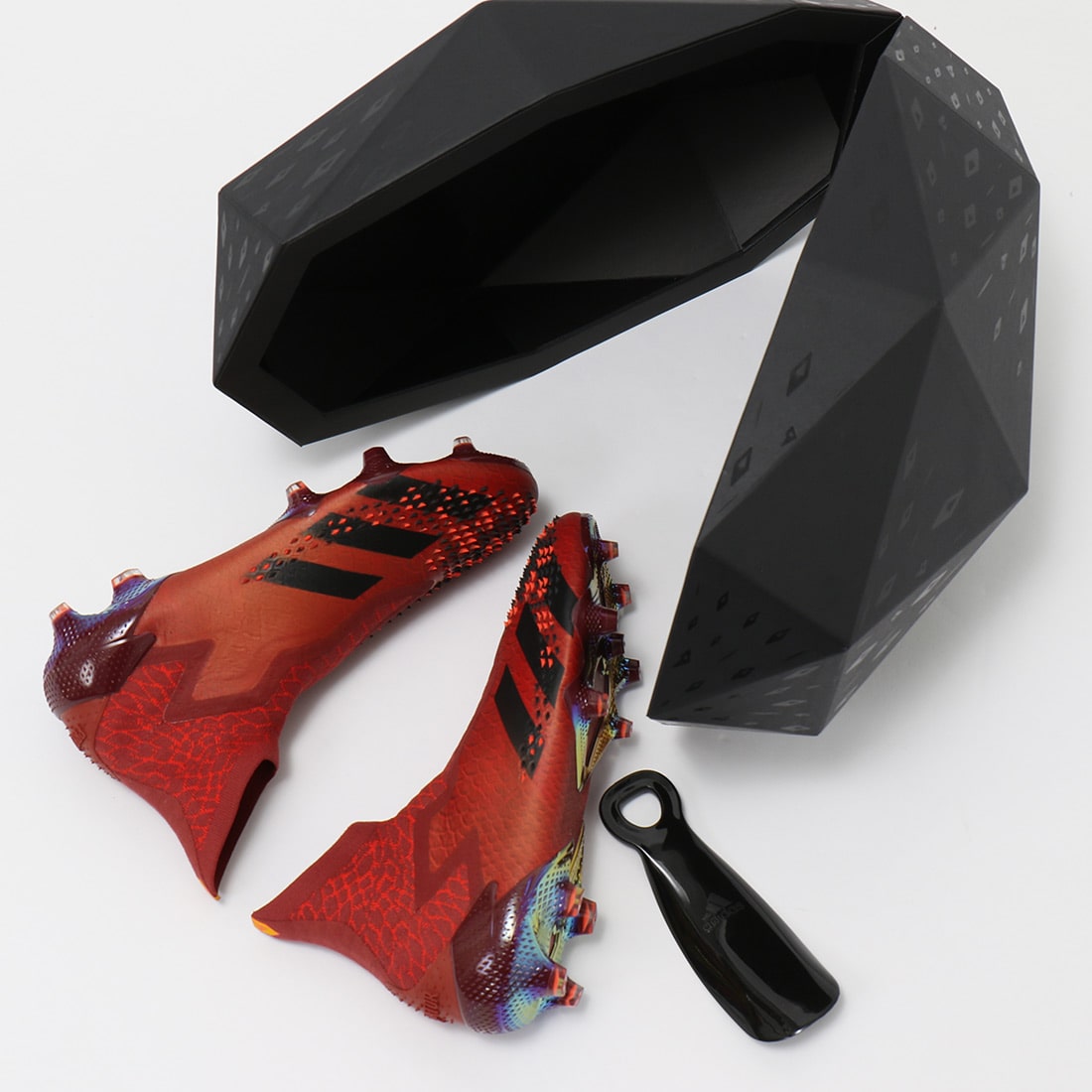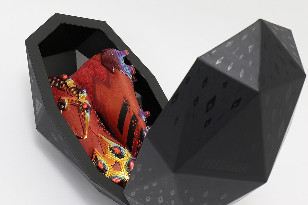 ドラゴンの卵をイメージした特別仕様のボックスに詰まったスパイクとスニーカーの限定コレクション「DRAGON PREDATOR」。