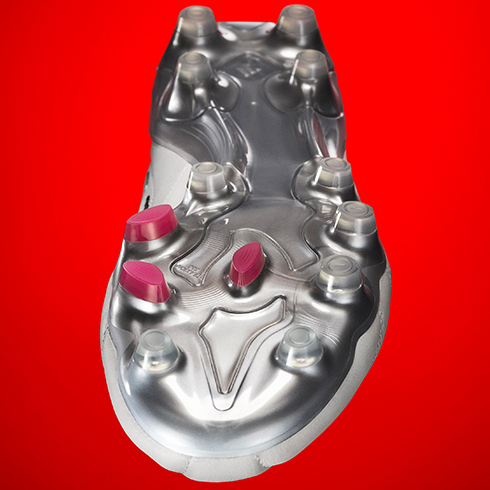 前足部内側のピヴォットスタッド(4本のトライアングルスタッドが円形配置)設定により、前後左右へのモーションやターンを行いやすい。