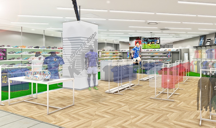 当店はジュニアから学生・大人まで、すべての競技者の皆様のプレーを支えるため、サッカーシューズをはじめとしたサッカーギアに加え、日本代表やJリーグ、海外代表・クラブのユニフォーム等のアパレルやファングッズも幅広く品揃えし、すべてのサッカーファンの皆様をお迎えいたします。