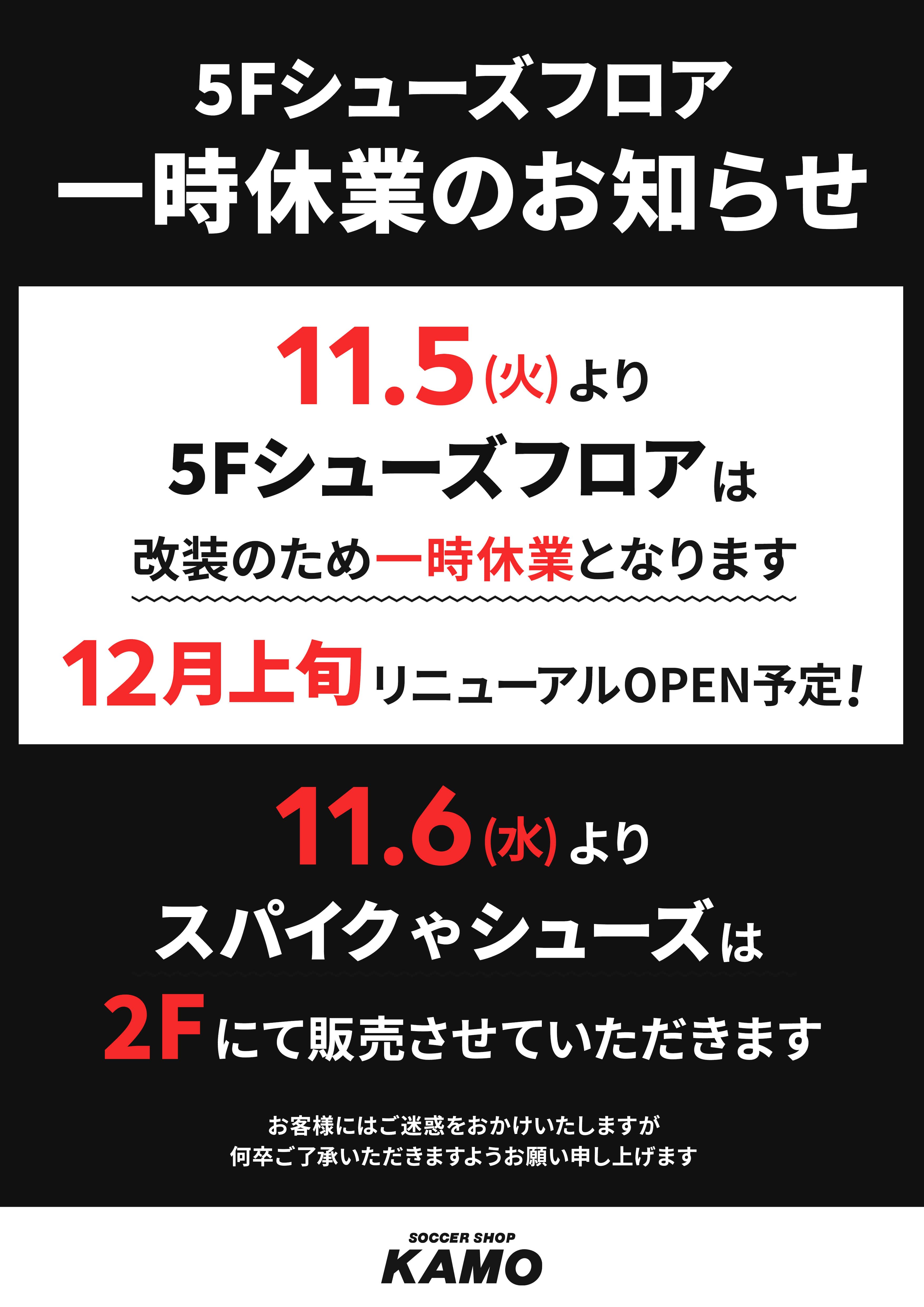 渋谷店 5F シューズフロア 改装による休業のお知らせ