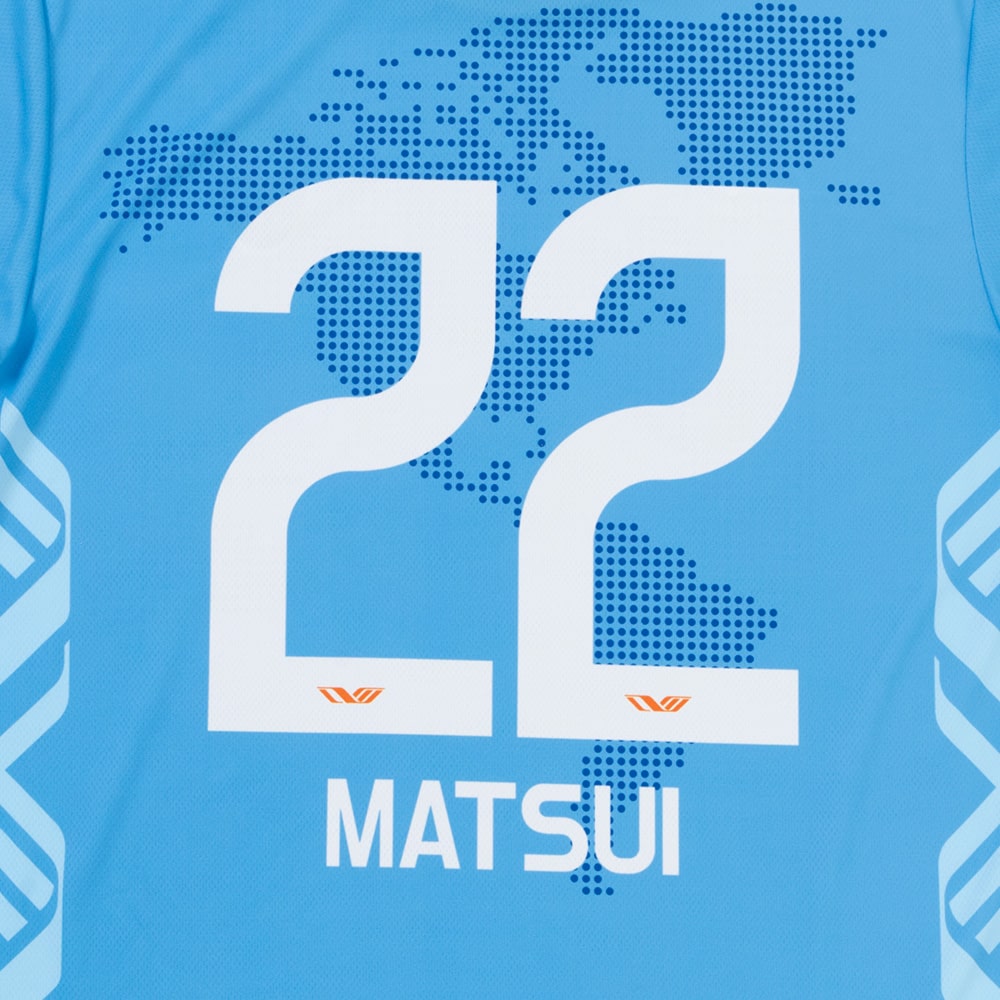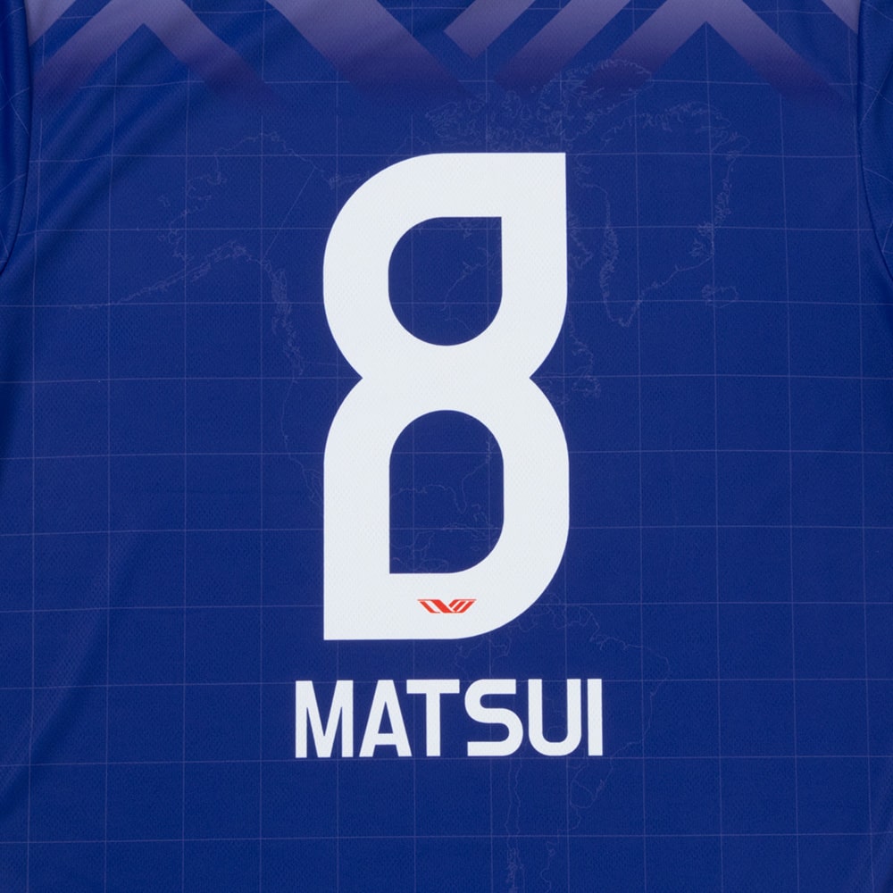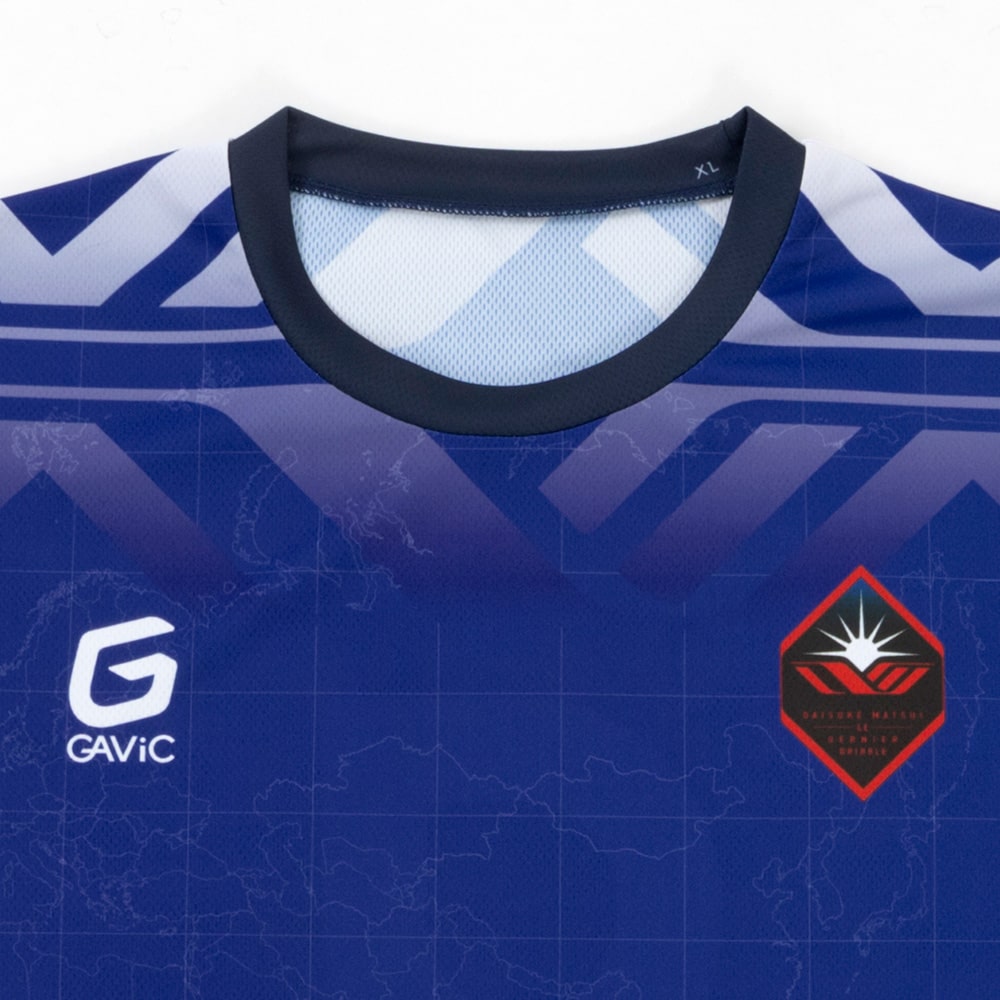 GAViC、デザインは大橋高歩。オリジナルDMロゴを肩周りに配し、世界を股にかけて活躍した松井選手へ敬意を込めて地球儀をモチーフにしたデザインにしました。2010 FIFAワールドカップ時のユニフォームのカラーをイメージ、松井選手の伝説的なオーバーヘッドのシルエットをモチーフにしたオリジナルロゴが裾に入ります。