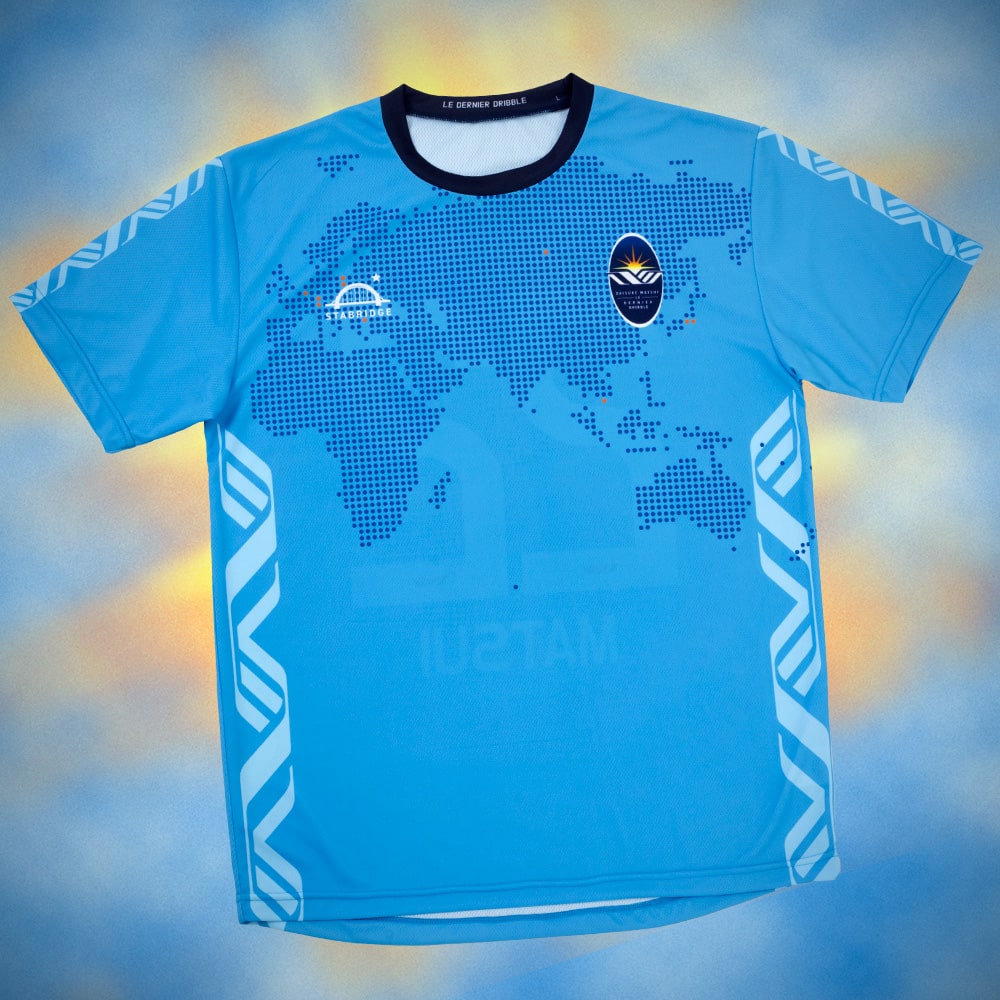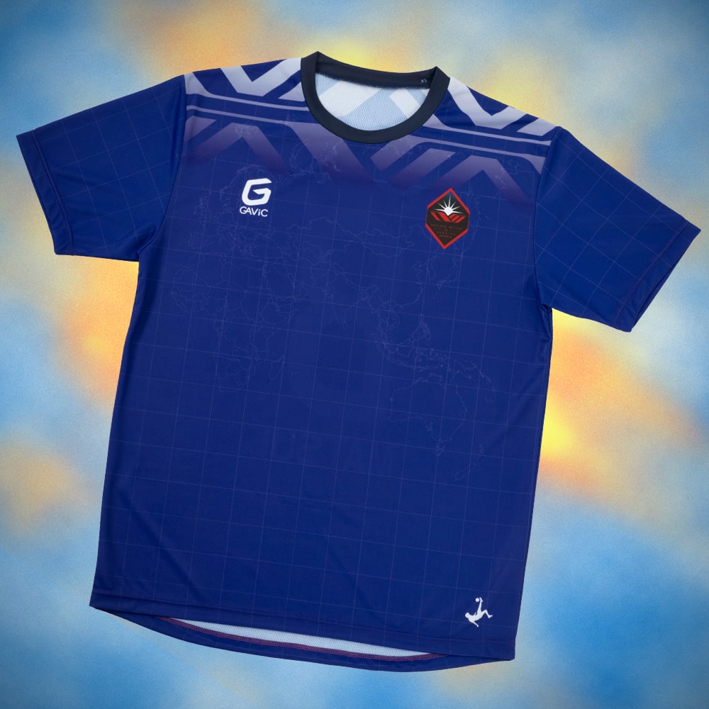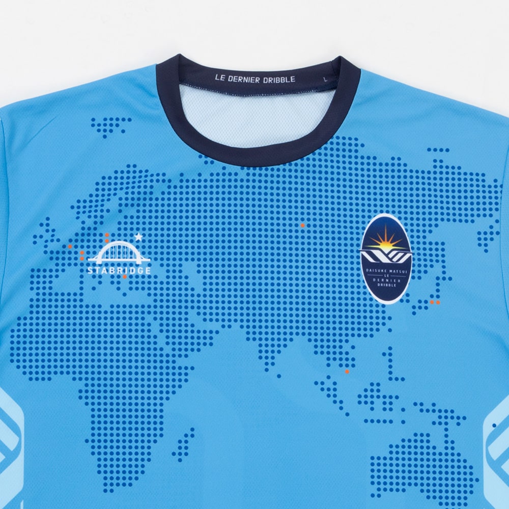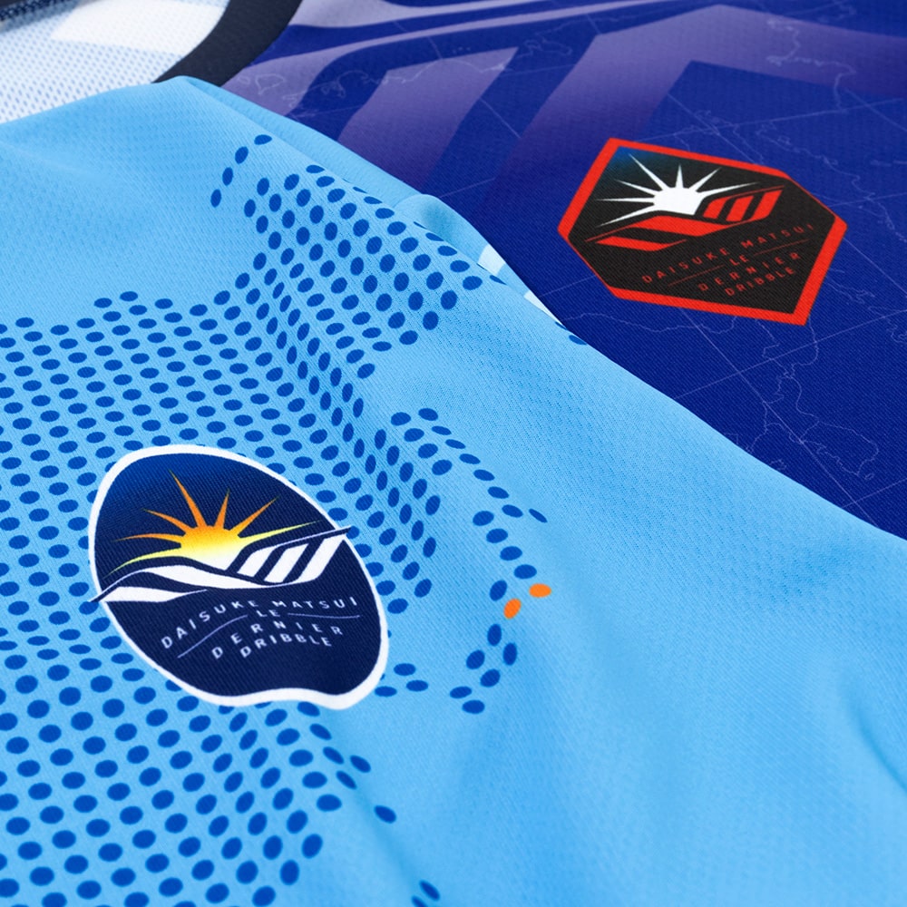 GAViC、デザインは大橋高歩。オリジナルDMロゴを肩周りに配し、世界を股にかけて活躍した松井選手へ敬意を込めて地球儀をモチーフにしたデザインにしました。2010 FIFAワールドカップ時のユニフォームのカラーをイメージ、松井選手の伝説的なオーバーヘッドのシルエットをモチーフにしたオリジナルロゴが裾に入ります。
