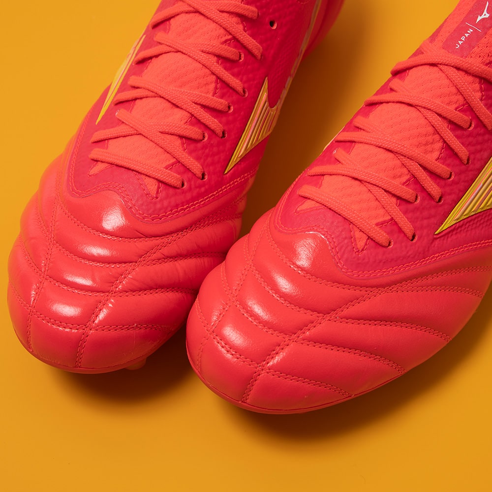 モレリア ネオⅣ ジャパン:中足部の素足感覚はキープしつつ、フレームを搭載することでホールド感の向上を追求。モレリア ネオⅣ β ジャパン:中足部のメッシュ素材は軽くて柔らかい日本製材料を採用。更なる素足感覚を追求。