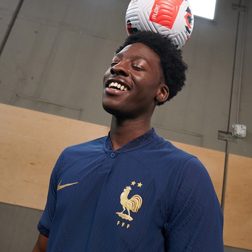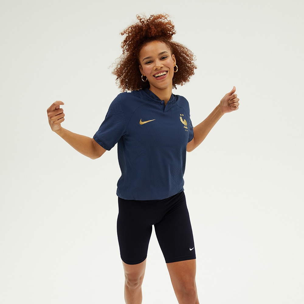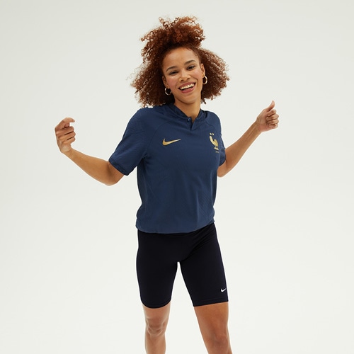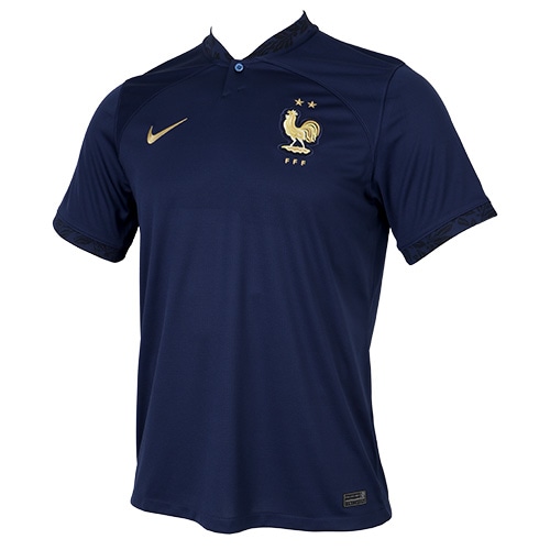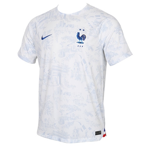 フランスのコレクションは、伝統と未来を融合し、新しいフランスを祝福します。ホームユニフォームのナラの葉とオリーブの枝は強さ、連帯と平和を意味します。ショーツ 脇、ソックスのジャカード柄と袖口に使ったトリコロールと金色のディテールは、伝統的なフランスのデザインを取り入れています。伝統的なプリント生地であるトワルドジュイから着想を得たアウェイユニフォームのグラフィックには、雄鶏、植物、凱旋門やクレールフォンテーヌ(国立サッカー養成所)など、フランスや代表チームにとっての象徴的な図柄を取り入れています。