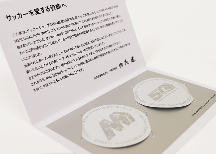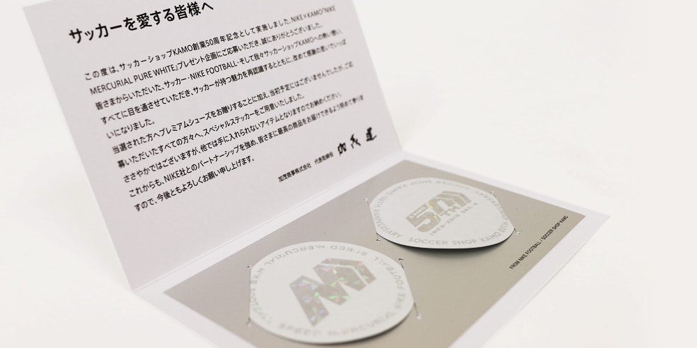 サッカーショップKAMO創業50周年記念として実施した、NIKE×KAMO『NIKE MERCURIAL PURE WHITE』のプレゼント企画に、たくさんのご応募をいただき誠にありがとうございました。