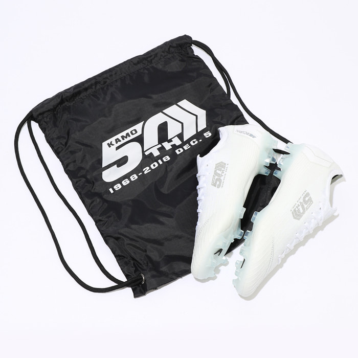 サッカーショップKAMOの50周年を記念して作られたこのシューズに刻まれているスペシャルロゴは、デザイナー