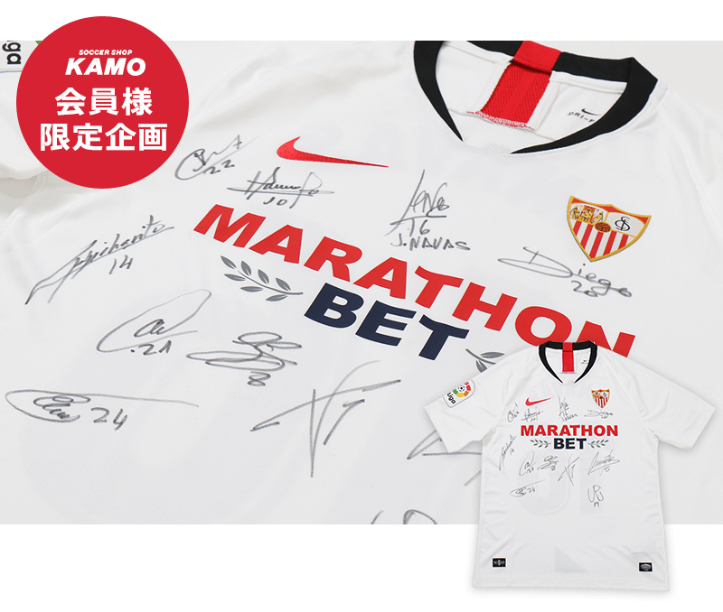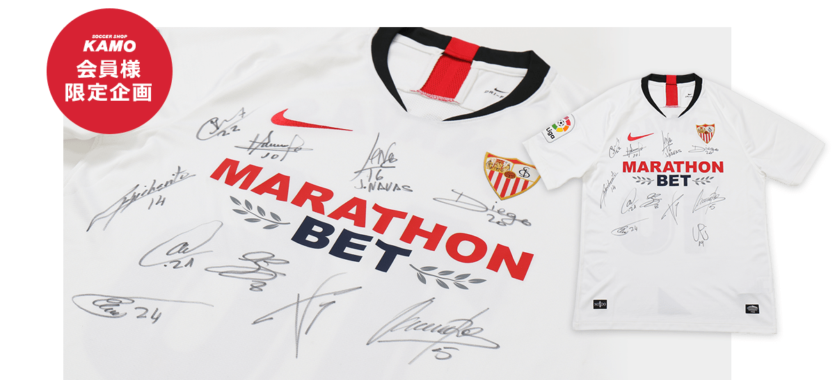 サッカーショップKAMOで、19-20シーズンモデルのセビージャFCユニフォームをキャンペーン期間にご購入いただいた会員様の中から抽選で1名様に、「選手のサイン入りホームユニフォーム」をプレゼントいたします!