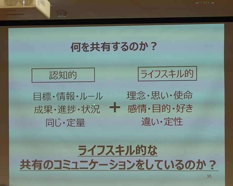 メールなどで認知的情報を送る方が楽だが、コミュニケーションをとりライフスキル的情報を共有することが重要。