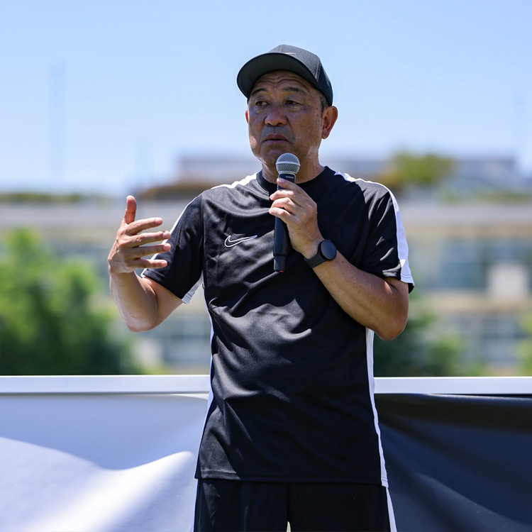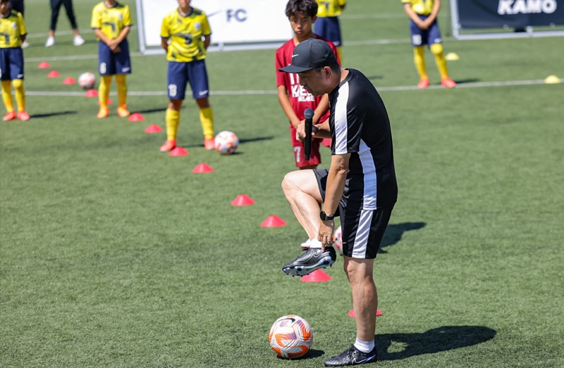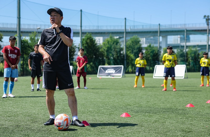 オンピッチの講師には、元サッカー日本代表で現在はセレッソ大阪スポーツクラブ技術委員長を務めるかたわら、指導者・選手育成プロジェクト「KAZAMA JUKU PROJECT」の活動を行う風間八宏氏をお招きし、代名詞の「止める・蹴る」にフォーカスしたトレーニングを中心にゲーム中に武器になる技術を教えていただきました。