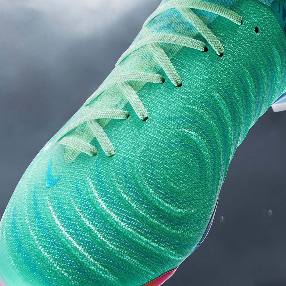 粘着性のある『ナイキ グリップ ニット』により抜群のボールタッチを実現しています。スパイクの親指側からシューレースを越えて小指側までのキックゾーンを1枚の『ナイキ グリップ ニット』でカバーすることで、優れたボール捌きが可能となっています。足の形状にフィットし、湿度の高い環境でも乾燥した環境でも優れたグリップ性を発揮します。 アッパーには嵐から着想を得た渦状のテクスチャーが施されています。正確でより攻撃的なポジショニングを可能にするため、その渦の中心部分はシュートを打つ際にボールに当たる攻撃的な位置に配置されています。