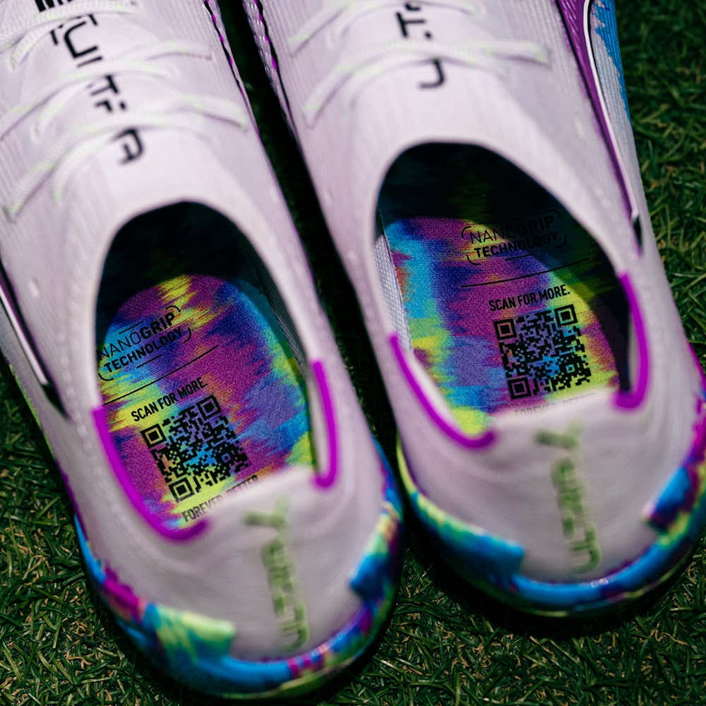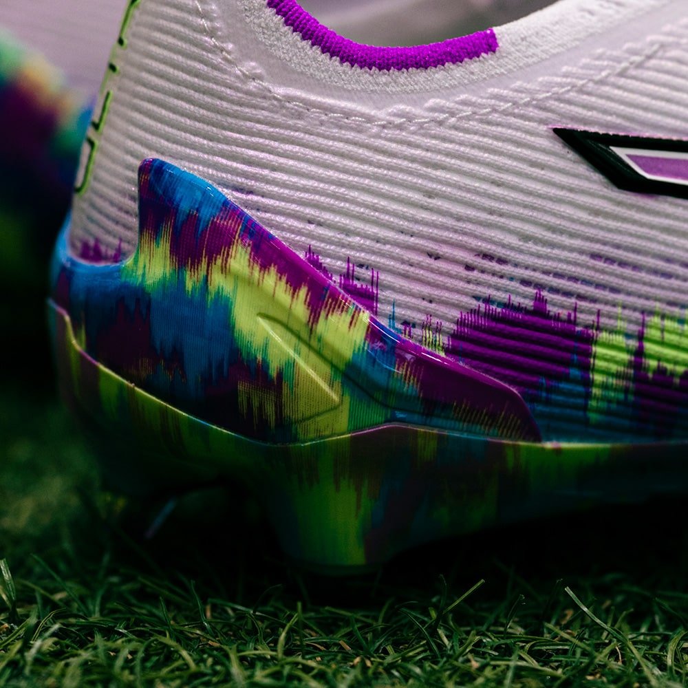 アッパーのベースメントには、軽量のエンジニアードメッシュアッパーを採用。編み込みのテンションや網目の大きさを効果的に調整しています。これにより、耐久性が必要な部分は編み込みを強くし、柔軟さが必要な部分は編み目を大きくし、耐久性を備えつつも、柔軟性、軽量性を兼ね備えている。極薄のマイクロファイバーで形成されるグリップアッパー素材に凹凸の加工を追加。スピードに乗った際でも的確なボールコントロールとシュートをサポートします。さらに全面を覆うことで、スピードに乗った際のシューズの保形性を持たたしつつ、濡れたピッチでの水の浸透を軽減する効果も発揮。