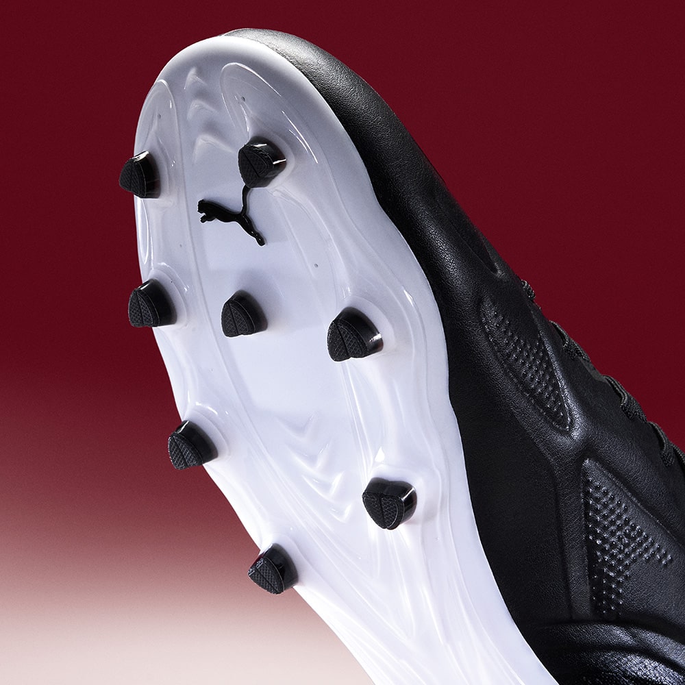 アウトソールには新しいソールユニットを採用。PebaxナイロンとPUから形成される軽量アウトソールで、丸形をベースにしたスタッドは、様々な動きにグリップ力を発揮し機動性を高める。中足部に配置されたシャンクが中足部の捻じれを抑制し、力の分散を抑える効果をもたらす。FG/AGにのみ配置したエクストラヒールカウンターが踵部分のフィット感を生み出し動きのブレを抑制する。この新しいアウトソールがピッチを支配するプレーを生み出す。