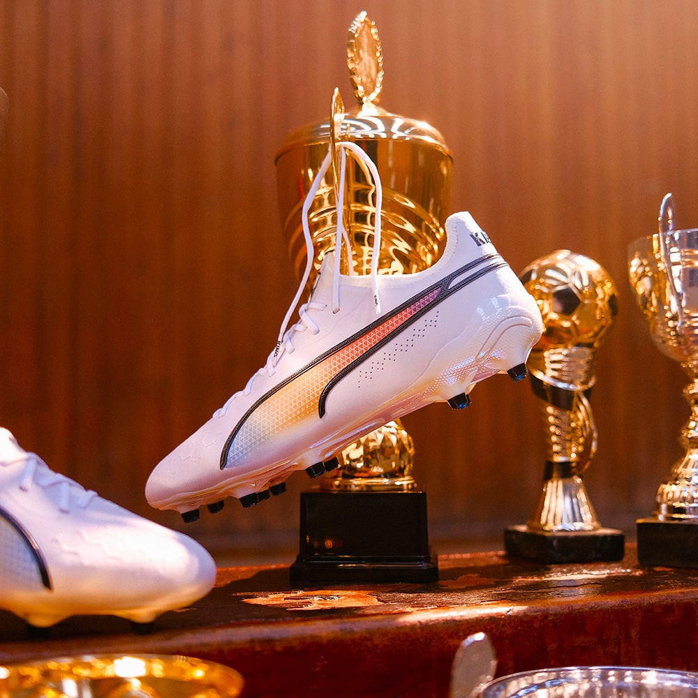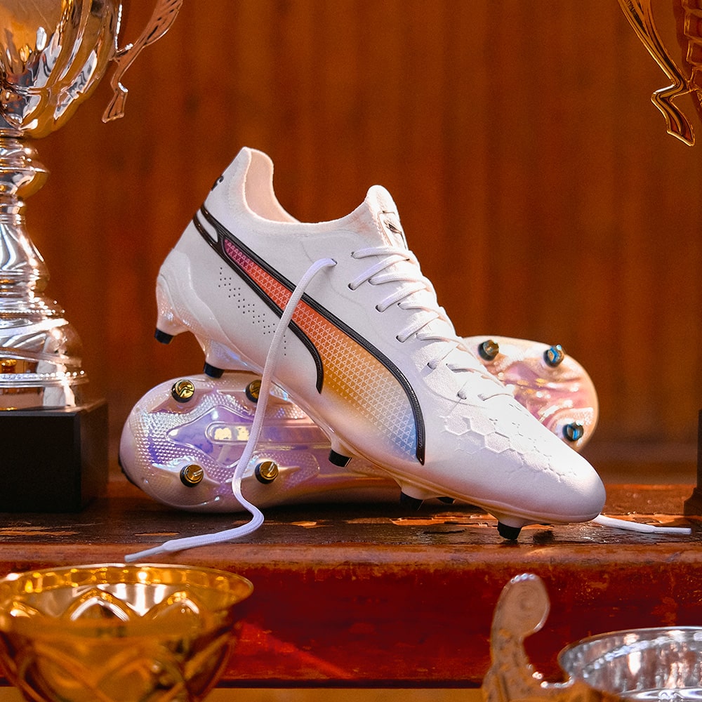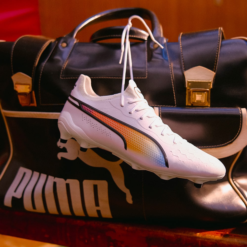 プーマ キングの2023春夏限定モデルが登場!プーマ キングを着用した偉大な選手たち(エウゼビオ、ペレ、ヨハン・クライフ、マテウス、ディエゴ・マラドーナ)を讃え、PUMA、KING、そしてフットボールそのものの歴史を共に作り上げた5人のアイコンのナショナルカラーを組み合わせた特別なカラーウェイ。