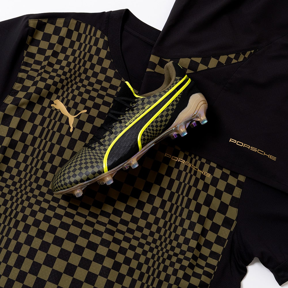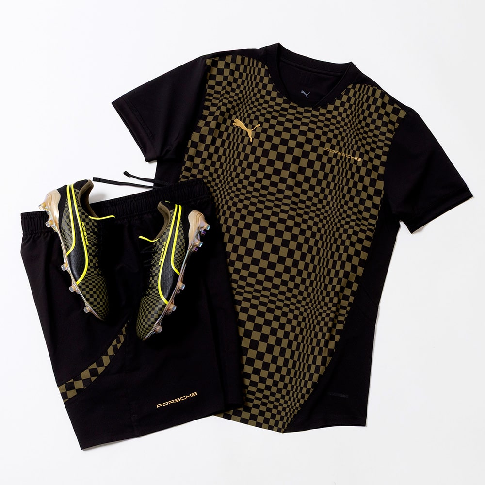 プーマキングがポルシェとコラボレーションした、2025年春夏の新作スパイクとウェアが登場!ポルシェの象徴的なシート生地からインスピレーションを得て、1970年代の「パシャパターン」をデザインに採用しています。 サッカーショップKAMOでは、渋谷店、梅田店、オンラインストア限定発売!