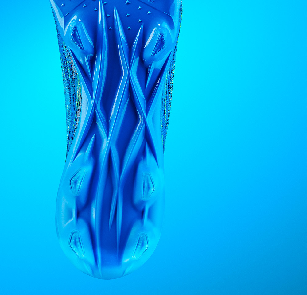 ソールプレートには、前方部分に施された小型のスタッドと、 V字型のスタッドを兼ね備え、稲妻のようなスピードや加速が可能に。