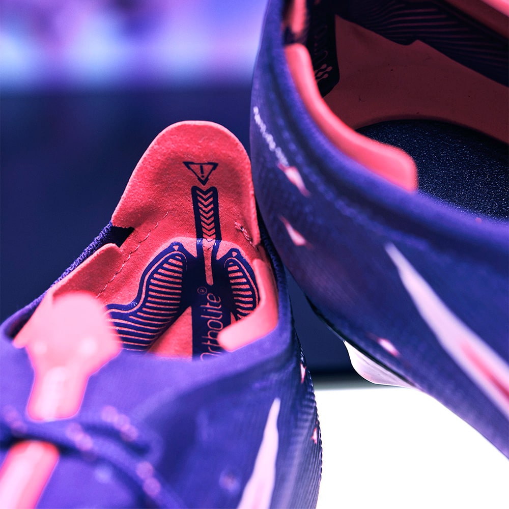 足馴染みの良い、『Light weight mesh Upper』を採用。『CARBON/ULITIMATE』にはトップレイヤーに『GRIP CONTROL PRO』を使用。極薄のマイクロファイバーで形成されるグリップアッパー素材をアッパー全面に覆ったことにより、スピードに乗った際のボールコントロール性を高めるだけでなく、シューズの保形性をサポート。また濡れたピッチでの水の浸透を軽減する効果もあり、常に軽量な状態のキープが可能。
