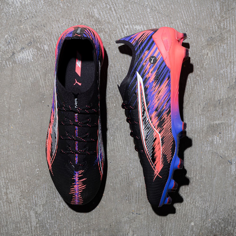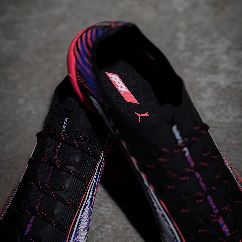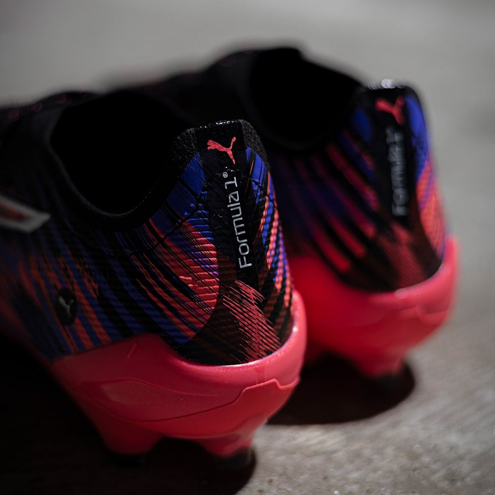 いずれのフィールドでも全てがあっという間に過ぎ去ります。F1の速さと、その音を融合し表現したコラボレーションモデルです。 自動車工学の頂点からインスピレーションを得ており、F1エンジンの音をイメージしたグラフィックと、スピード感を表現するようなぼかしたカラーが特徴です。フットボールピッチにおいても、フルスロットルで圧倒的なスピード感を表現します。