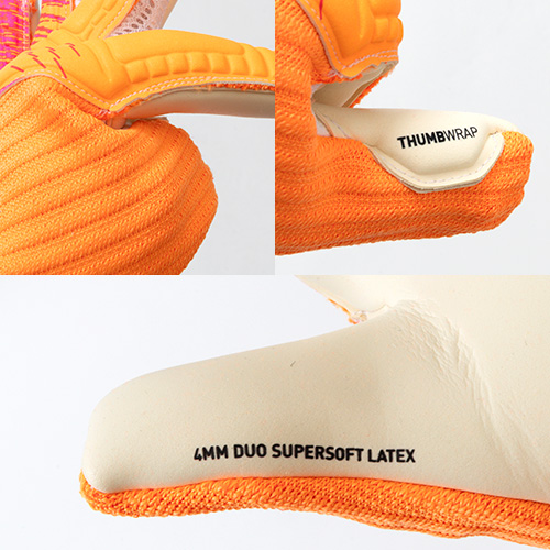 ●手のひらには濡れた状態でも乾いた状態でもグリップ力が高い4mm Duo Soft ラテックス製パームを使用し、グリップ力を高める。柔軟性とパンチ力を高めるエンボス加工のラテックスバックハンド。