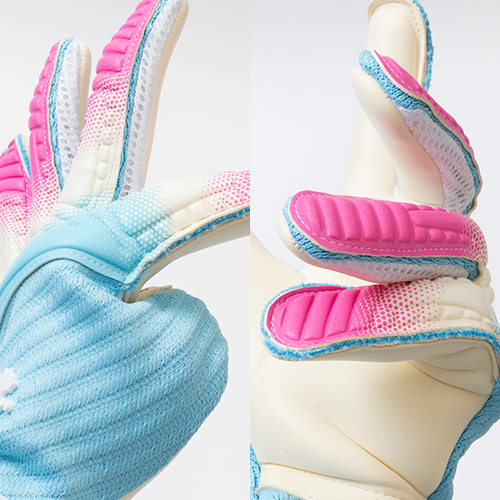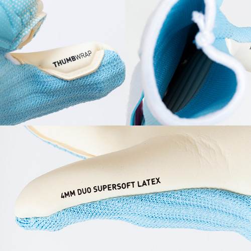 ●手のひらには濡れた状態でも乾いた状態でもグリップ力が高い4mm Duo Soft ラテックス製パームを使用し、グリップ力を高める。柔軟性とパンチ力を高めるエンボス加工のラテックスバックハンド。