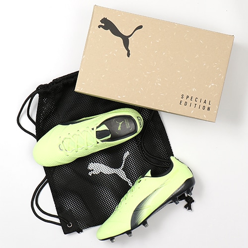 アニマルフリー素材のみを使用した 100%ヴィーガンのサッカースパイクが2022年秋冬NEWカラーが登場!軽量かつラグジュアリーなルックス、パフォーマンス性の高さで知られる「PUMA KING Platinum(プーマ キング プラチナム)」のVEGAN(ヴィーガン)仕様FG(ファームグラウンド)/AG(アーティフィシャルグラス)対応トップモデルスパイク。