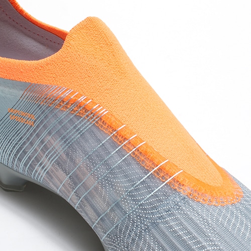●素早く着脱できるレースレスで仕上げ、軽量ポリエステル素材で構成されたメッシュアッパーが、更なるスピードを生み出す。サイドパネルはカットアウトしたスピードケージが最大限の軽量化を追求し、保形性を高め走りをサポート。