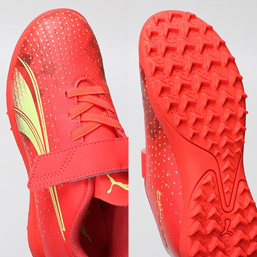 - 2022年10月14日(金)発売。2022年冬コレクション「FEARLESS PACK」が登場。電光石火、稲妻スピード。稲妻のようにピッチを駆けるプレーヤーのための超軽量モデル『ULTRA(ウルトラ)』のプレイモデルのTT(ターフトレーニング)対応ジュニア用トレーニングシューズのベルクロタイプ。