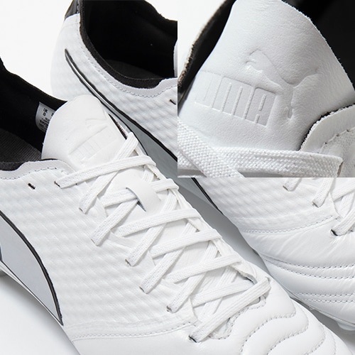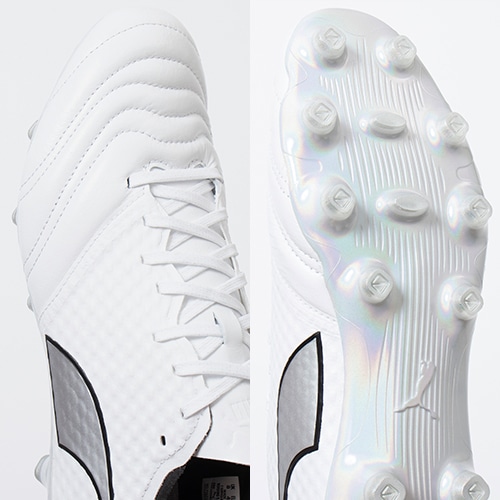 ●前足部には精密なボールコントロールを生み出すプレミアムカンガルーレザーを使用し未来を感じさせるコーティング。中足部より後ろには素足感覚でフィットする超軽量のスピードメッシュで構成されたアッパーを採用。伝統的なレザーブーツのボールタッチと革新的な軽量性の両立を実現。
