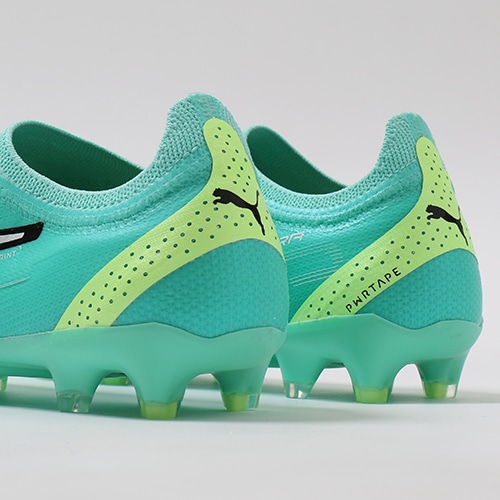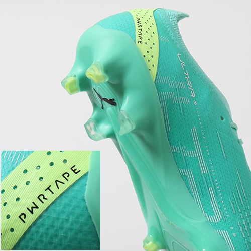 ●樹脂ベースで作られたPUMA独自のサポート素材PWRTAPE(パワーテープ)。軽量かつ柔軟性のあるこの素材は、必要な箇所に圧着で配置することが可能。今回はよりホールド感を高めるためヒール部分に採用しています。
