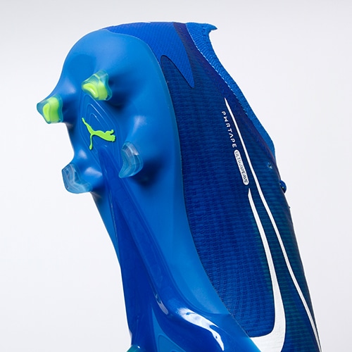 ●樹脂ベースで作られたPUMA独自のサポート素材PWRTAPE(パワーテープ)。軽量かつ柔軟性のあるこの素材は、必要な箇所に圧着で配置することが可能。今回は足の甲の骨格構造をベースに配置し、密着したアッパーをスムーズに屈曲させることで蹴り出し時に反発し鋭い動きを生み出す。また、力の掛かりやすい部分に配置をすることで、アッパーの保形性もサポート。