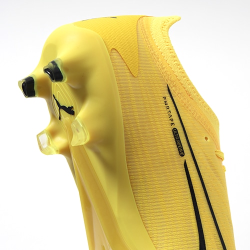 ●樹脂ベースで作られたPUMA独自のサポート素材PWRTAPE(パワーテープ)。軽量かつ柔軟性のあるこの素材は、必要な箇所に圧着で配置することが可能。今回は足の甲の骨格構造をベースに配置し、密着したアッパーをスムーズに屈曲させることで蹴り出し時に反発し鋭い動きを生み出す。また、力の掛かりやすい部分に配置をすることで、アッパーの保形性もサポート。