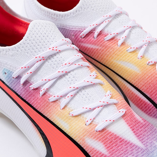 ●速さを追求して生まれたPUMA独自の新素材ULTRAWEAVE(ウルトラウィーブ)をアッパーに採用。従来のウーブン素材に比べ、圧倒的な軽さを実現。さらに、柔軟性にも優れるこの素材はアッパーと足の一体感を高めその効果を最大限に引き出し、その軽さと柔軟性が今までにないスピードを生み出します。