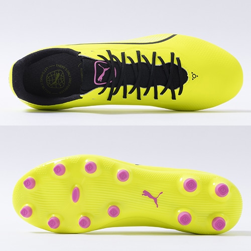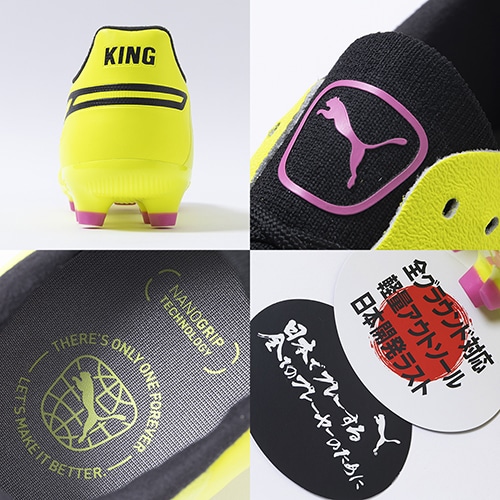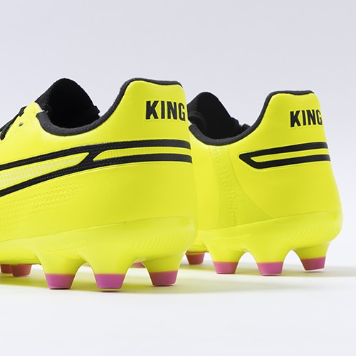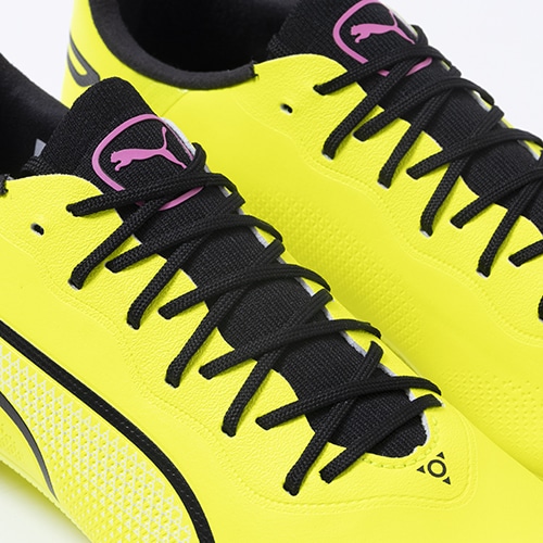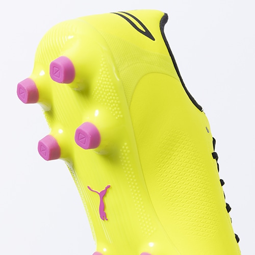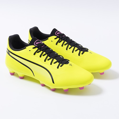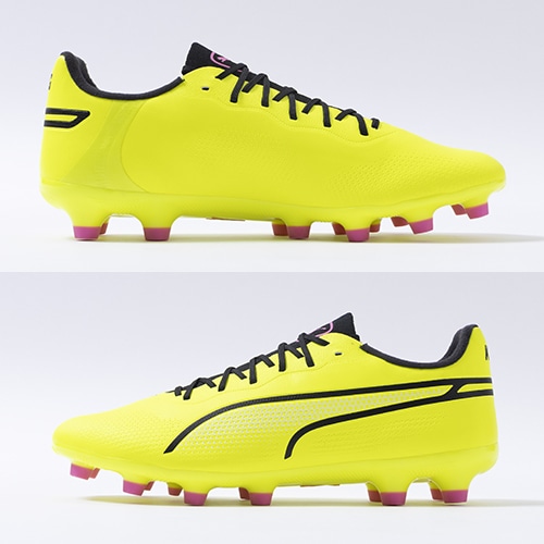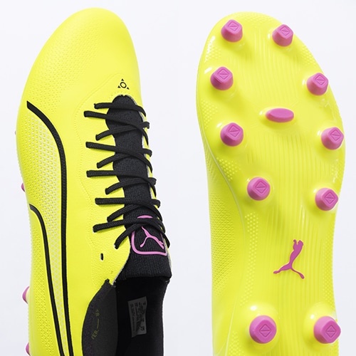 精密一閃、高機動コントロール。レザーのフィット感やボールタッチはそのままに、機動性を兼ね備えた「PUMA KING(プーマ キング)」のプロモデルHG(ハードグラウンド)/AG(アーティフィシャルグラス)対応スパイク。