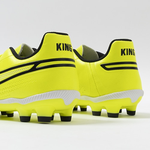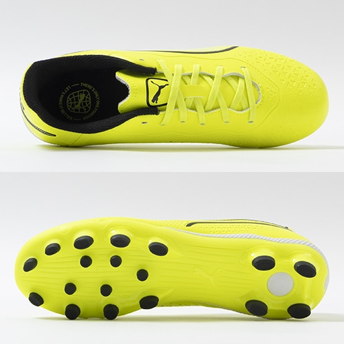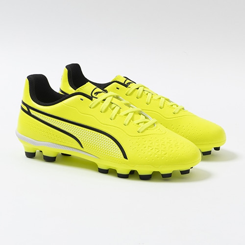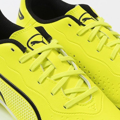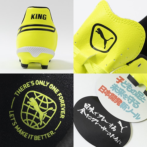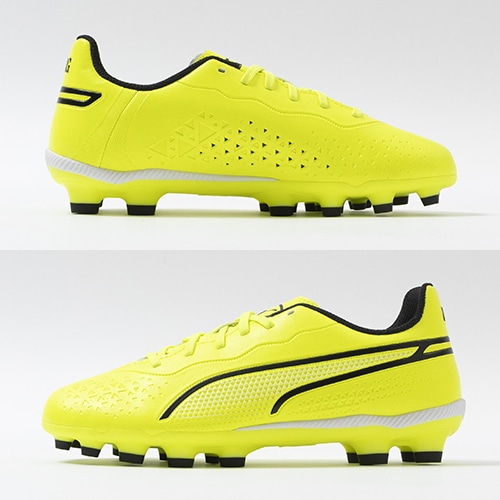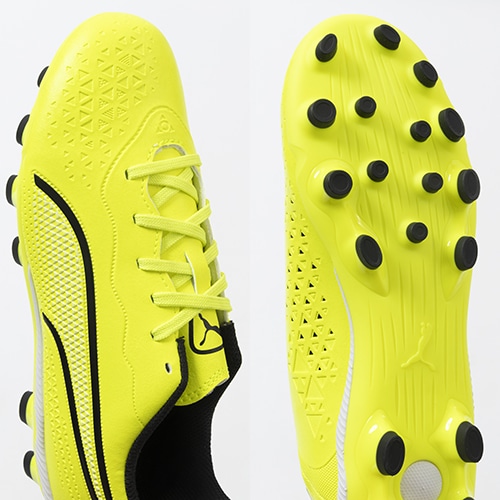 精密一閃、高機動コントロール。レザーのフィット感やボールタッチはそのままに、機動性を兼ね備えた「PUMA KING(プーマ キング)」のマッチモデルHG(ハードグラウンド)/AG(アーティフィシャルグラス)対応ジュニア用スパイク。