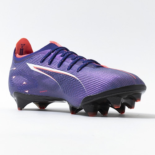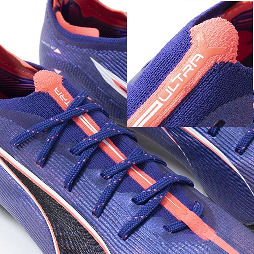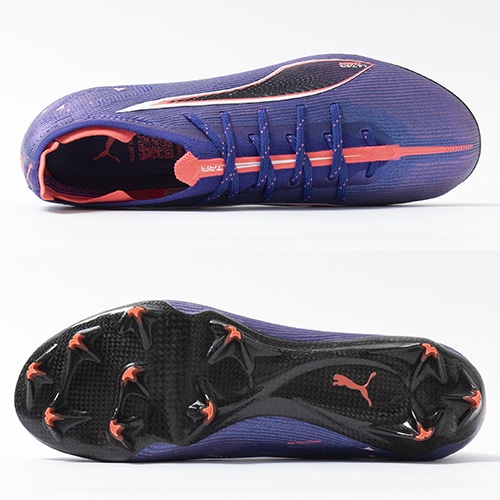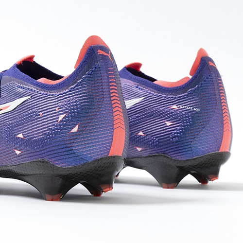 ●『SPEEDSYSTEM』アウトソールは、ULTRAの為に開発されたプーマ独自の新アウトソール。弾力性のあるカーボンファイバー素材を組み合わせて素早い推進力を発揮しています。推進力は前モデルより32%向上しています。学術的な研究から多くのテストを繰り返し開発されたT字型の『FastTrax』スタッドは、加速、ターン、クイックなフェイントに対して、最適な蹴りだしをもたらす。