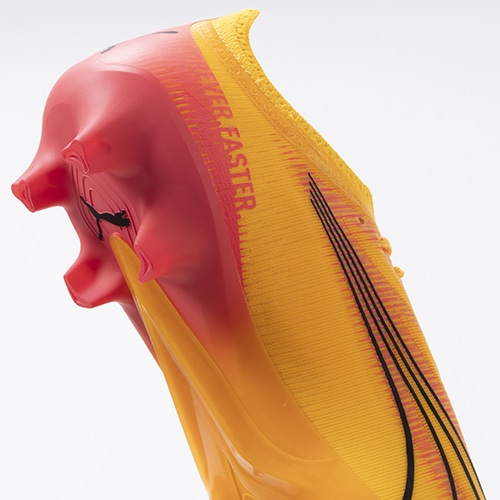 ●樹脂ベースで作られたPUMA独自のサポート素材PWRTAPE(パワーテープ)。軽量かつ柔軟性のあるこの素材は、必要な箇所に圧着で配置することが可能。今回は足の甲の骨格構造をベースに配置し、密着したアッパーをスムーズに屈曲させることで蹴り出し時に反発し鋭い動きを生み出す。また、力の掛かりやすい部分に配置をすることで、アッパーの保形性もサポート。