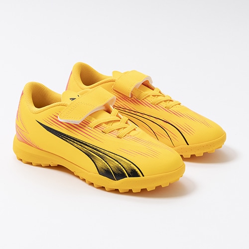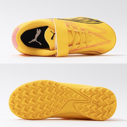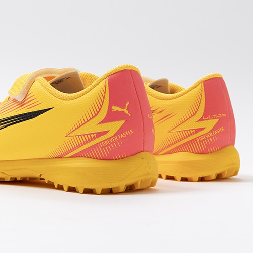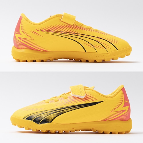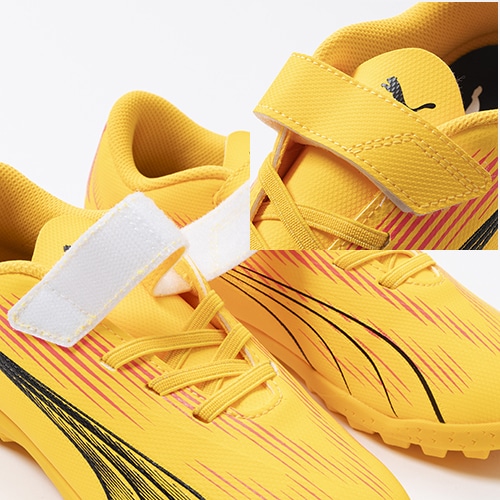 電光石火、稲妻スピード。稲妻のようにピッチを駆けるプレーヤーのための超軽量モデル『ULTRA(ウルトラ)』がアッパーのデザインをアップデート。プレイモデルのTT(ターフトレーニング)対応ジュニア用トレーニングシューズのベルクロタイプ。