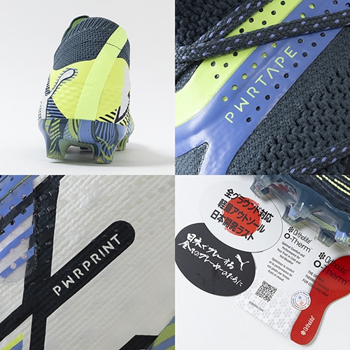 ●PWRTAPE(パワーテープ)は樹脂ベースで作られたPUMA独自のサポート素材。軽量で強度と柔軟性に優れるこの素材は必要な個所に圧着で配置することが可能。今回は人間工学に基づき幾度もの試験を重ね、さらにグレードアップ。最も効果的な配置で足ブレを抑え、プレイヤーの足の動きを安定させてあらゆる方向へのステップをサポート。