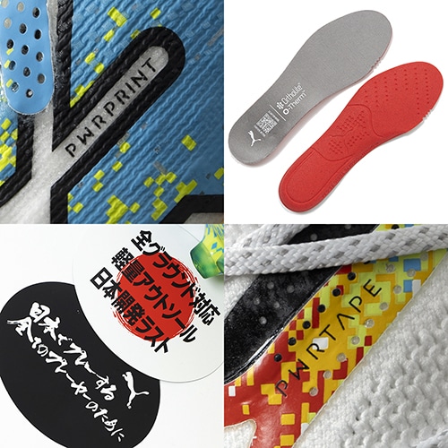 ●PWRTAPE(パワーテープ)は樹脂ベースで作られたPUMA独自のサポート素材。軽量で強度と柔軟性に優れるこの素材は必要な個所に圧着で配置することが可能。今回は人間工学に基づき幾度もの試験を重ね、さらにグレードアップ。最も効果的な配置で足ブレを抑え、プレイヤーの足の動きを安定させてあらゆる方向へのステップをサポート。