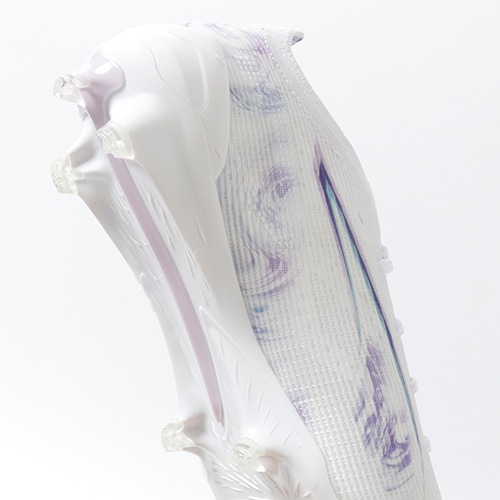 ●アッパーには軽量のエンジニアードメッシュアッパーを採用。編み込みのテンションや網目の大きさを効果的に調整し、耐久性が必要な部分は編み込みが強く、柔軟さが必要な部分は編み目を大きくしている。トップレイヤーに『GRIP CONTROL PRO』を使用し、極薄のマイクロファイバーで形成されるグリップアッパー素材をアッパー全面に覆ったことにより、スピードに乗った際のボールコントロール性を高めるだけでなく、シューズの保形性をサポート。また濡れたピッチでの水の浸透を軽減する効果もあり、常に軽量な状態のキープが可能。