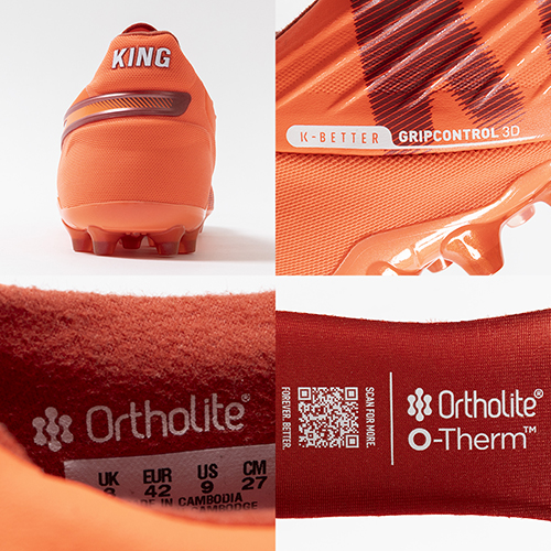 ●繊維を絡め合わせたような作りの不織布ベースは天然皮革の構造に最も近く高いフィット感を生み出し今までにはない強度を併せもつ「K-BETTERUPPER」を採用。従来のKING 同様の柔らかさを持ちながら、試合中にフィット感が崩れにくいことがこの素材最大の特徴。表面の加工は水の侵入をしにくくすることで軽量性を保ち、変わらないフィット感がボールコントロールをサポートし続ける。