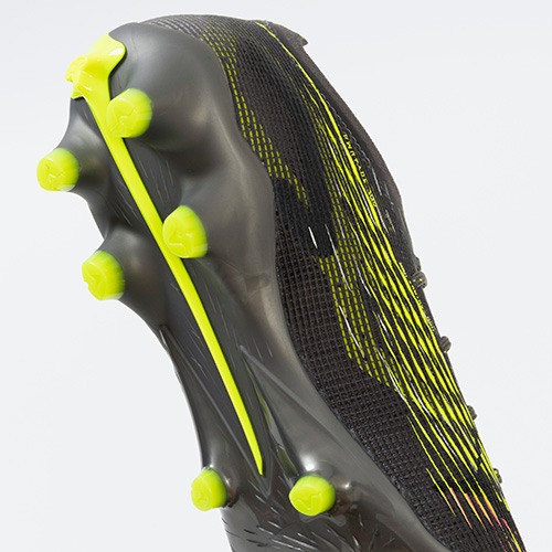 ●ベースにPebaxとポリウレタンを使用する事で軽量化を図りつつ、ULTRA最大の特徴である“加速力”をHG/AGソールにおいても発揮させる為に、開発されたULTRA専用のSPEED NEW OUT SOLE。スタッドチップには、溝を入れ込むことで加速を生む蹴り出しの際にグリップ力を発揮。また楕円形で方向を効果的に配置されたスタッドによって、加速の為の蹴り出しをサポート。また、中足部まで伸びたシャンクが安定感をもたらしつつ、蹴り出し時の反発を生み加速をサポートする。