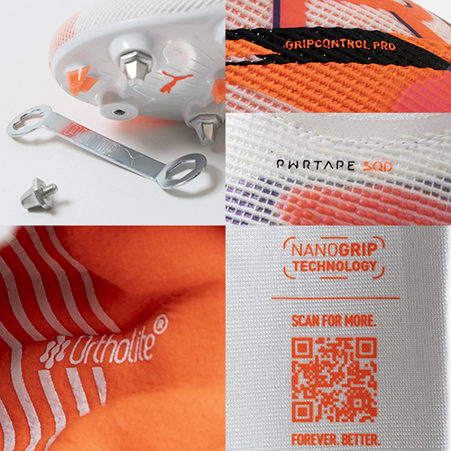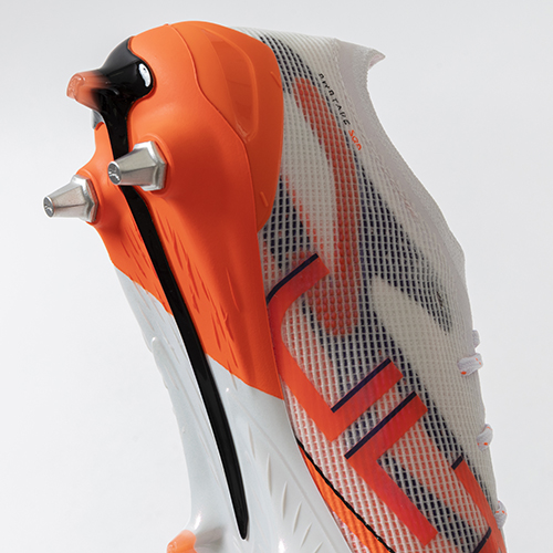 ●ULTRAの為に開発された、プーマ独自のアウトソール。軽量なPebaxをベースにピッチを掴み、そして強力な蹴り出しと加速力を生み出す革新的なスタッドシステムを採用。エネルギーリターンを最大化し、更なる加速を生み出す。学術的な研究から多くのテストを繰り返し開発されたT字型の『FastTrax』スタッドは、加速、ターン、クイックなフェイントに対して、最適な蹴りだしをもたらす。6本取替えスタッド+5本固定スタッドのミックスソールを採用。