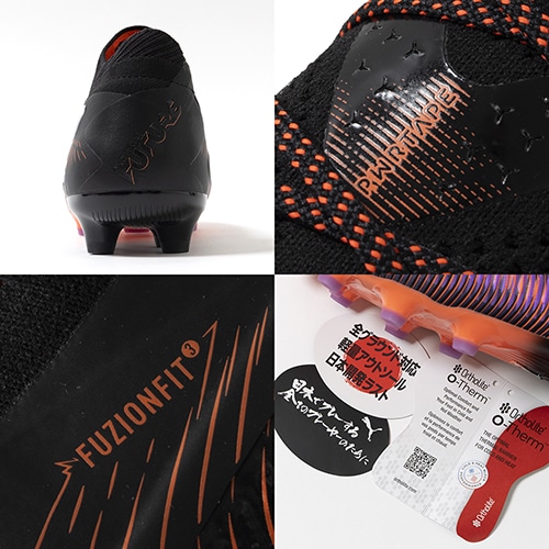 ●伸縮性の高いLYCRAと伸縮性に優れたニットで構成されたシューズのベースレイヤーは、第二の皮膚として機能し、足の動きに密着し、さらに適応性とサポート力のあるフィット感を実現します。複数に独立した3D PODSは、足の動きに沿いつつ全ての動きに対して、FUSION SKIN(フュージョン スキン)が足に沿うつくりになっています。また3D仕様のPODSがボールタッチ時の足のサポートをもたらします。