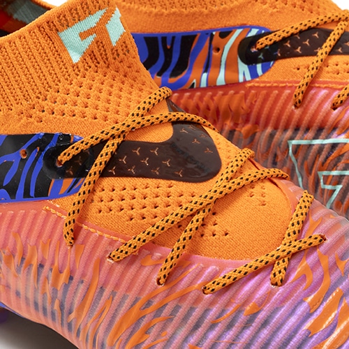 ●伸縮性の高いLYCRAと伸縮性に優れたニットで構成されたシューズのベースレイヤーは、第二の皮膚として機能し、足の動きに密着し、さらに適応性とサポート力のあるフィット感を実現します。複数に独立した3D PODSは、足の動きに沿いつつ全ての動きに対して、FUSION SKIN(フュージョン スキン)が足に沿うつくりになっています。また3D仕様のPODSがボールタッチ時の足のサポートをもたらします。