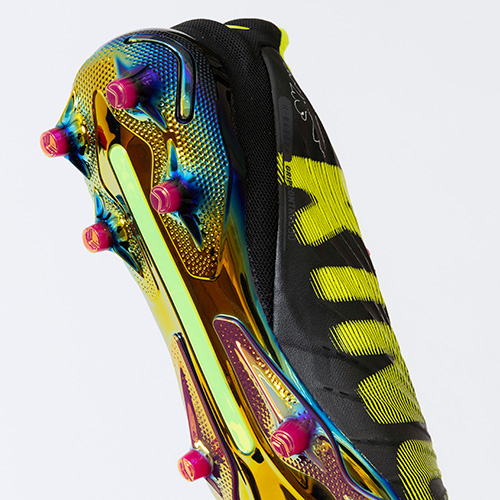 ●更なるボールコントロール性を高める為、インサイド面のアッパーに凹凸の3D加工とボールグリップの為「GRIPCONTROL 3D」のPUプリントを搭載。中足部の甲周りを「EVO KNIT SOCK」構造でフィットさせることで、横の動きへのサポートを強め、前方向への屈曲時足とシューズの密着度をあげ推進力を高める効果を発揮。90分間いかなる場面でも高度のコントロールと精密なパスで好機を演出する。