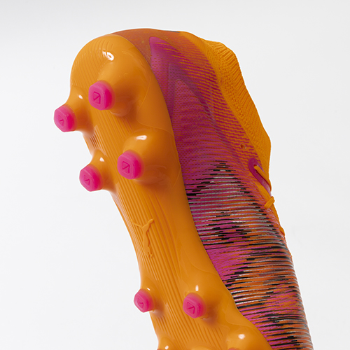 ●ベースにPebaxとポリウレタンを使用する事で軽量化を図り、台形のスタッドベースメントで安定性と強度をもたらすスタッドの地面接地面に凹凸をつけることで滑りを軽減。人工芝、土、天然芝での使用を可能にした軽量HG/AGソール。
