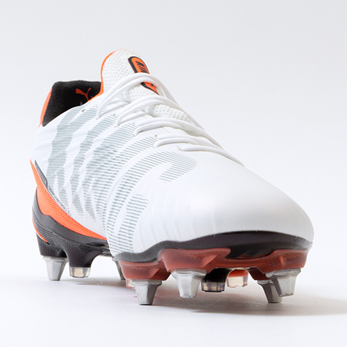 ●PebaxナイロンとPUで形成される軽量アウトソール。丸形のスタッドは様々動きにグリップ力を発揮し機動性を高める。中足部に配置されたシャンクが中足部の捻じれを抑制し力の分散を抑える効果をもたらす。アウトソールと一体となったヒールカウンターで踵のフィット感を高め、キック時の踏込みの安定感、様々なステップワーク時の踵のブレを抑制しする。6本取替えスタッド+5本固定スタッドのミックスソールを採用。