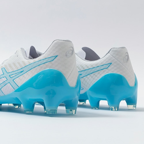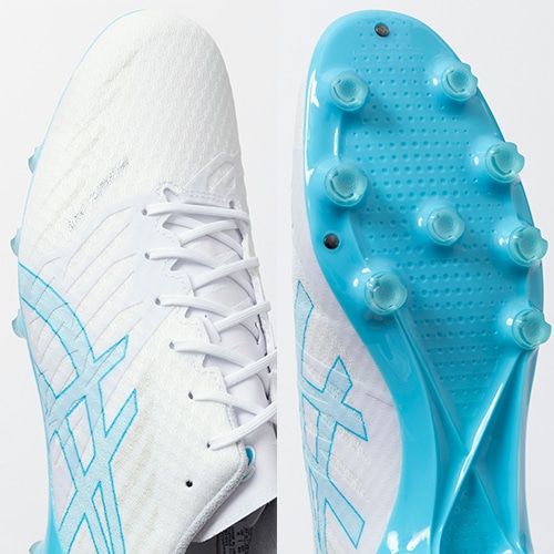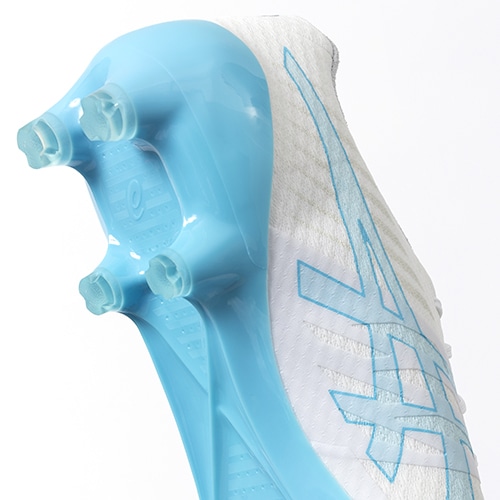 ●X-FLY 4と同じアウトソールを採用。外付けヒールカウンター搭載し、軽量性と反発性に優れたナイロン素材を使用。中足部に左右非対称のX字型のリブを成形。内側を低く、外側を高く設定することによって怪我につながる足の外側のねじれを軽減。フラットな接地感と適度な反発性が特徴で、グリップ力を発揮しつつ、スタッドの抜け感も良いバランスのとれたソール。