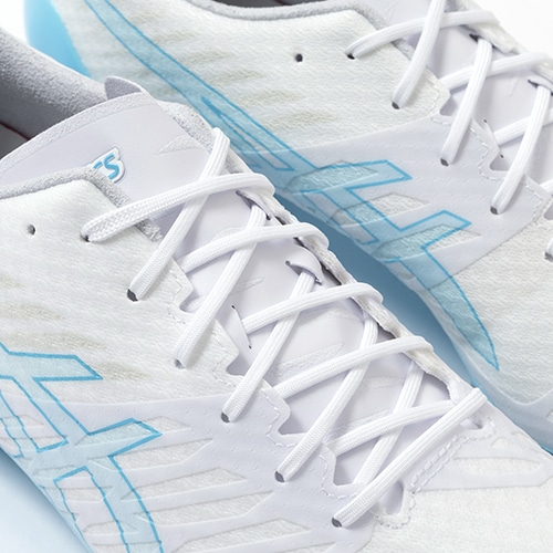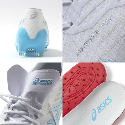 ●より柔らかいラッセルメッシュにフィルムをコーティングし、接着剤を減らすことでさらに柔らかいアッパーへと進化したACROS FIT(アクロス フィット)が、優れたフィット性とホールド性、柔軟性を同時に実現。補強材の配置を適切な位置に見直し、横ブレを軽減し、鋭い切り替えしを可能にする。